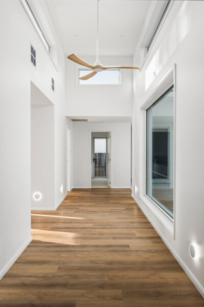 Scandinavian spaces often rely on natural materials to introduce warmth into otherwise minimal environments, and the Sanctuary DC reinforces this through expansive solid timber blades that showcase authentic grain and organic texture. Suspended overhead, the timber softens clean architectural lines and complements light oak flooring, wool textiles and simple handcrafted furnishings.