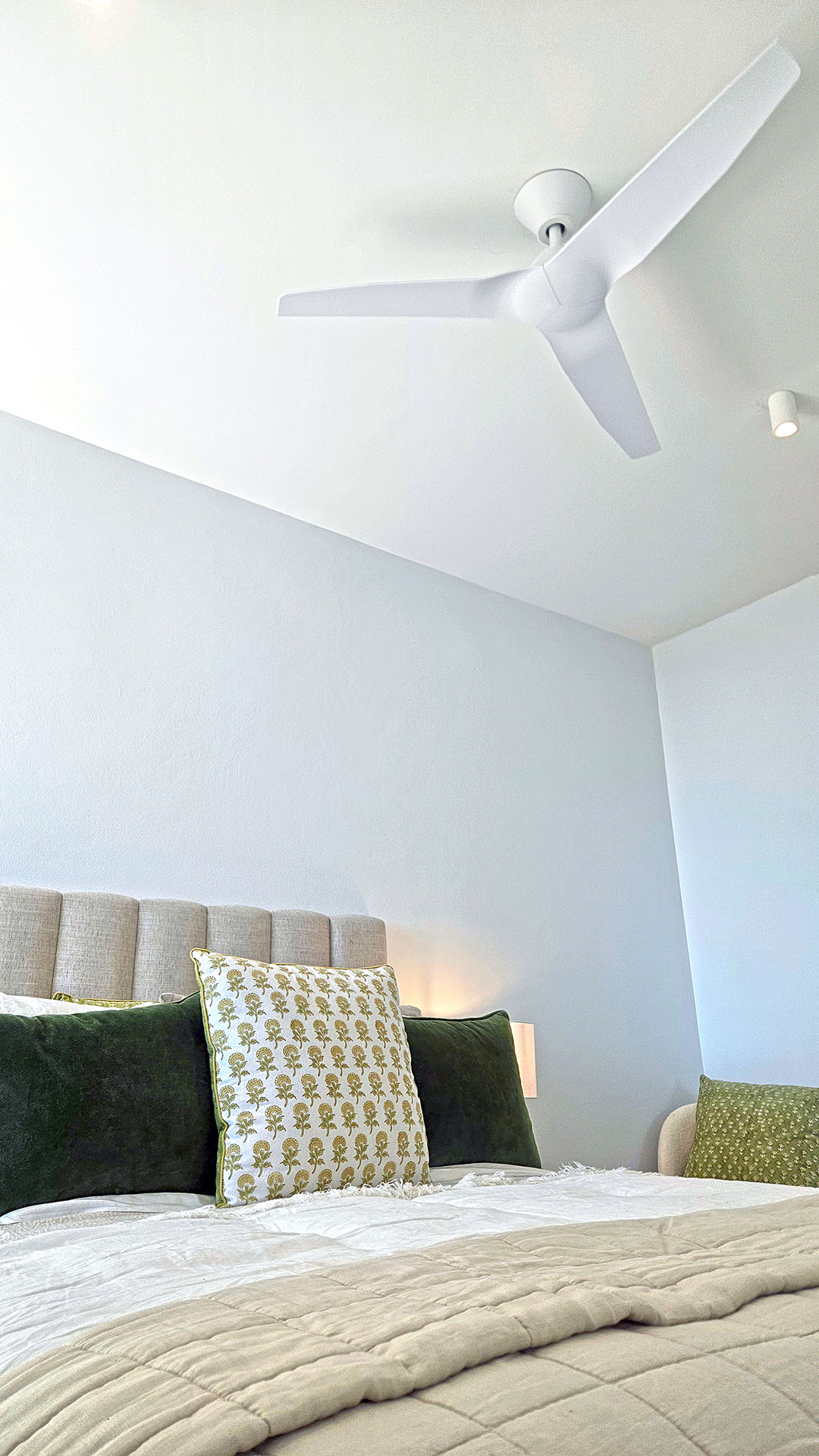 Within that logic in mind, they installed an Fanco Infinity iD DC 48″ in each of the bedroom spaces. The fans purpose is twofold: Primarily, the Infinity iD provides controlled air movement within the bedrooms, while remaining visually and auditorily quiet. The second is to support the aesthetic goals of the space, where the Infinity-iD’s refined geometry and understated profile seamlessly align with the contemporary interior Mitch and Mark were aiming for.