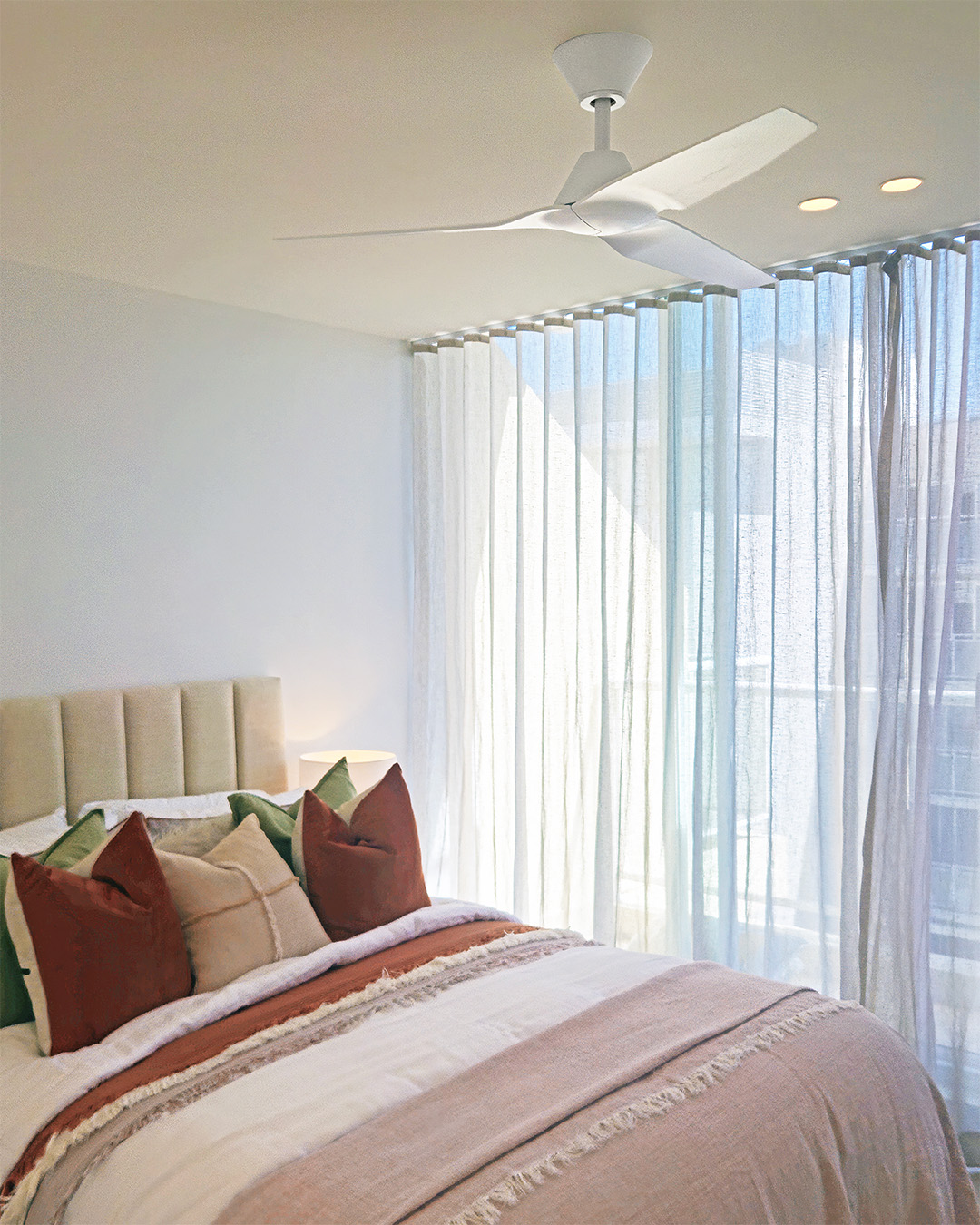 Each space within the home has different distinct comfort requirements, and bedrooms – where comfort is measured in subtlety and tranquility – are a space that has unique design considerations that others do not share. The Infinity-iD’s efficient DC motor supports low energy air circulation across a broad operating range, allowing the rooms to stay comfortable without the acoustic intrusion that undermines rest. Within the penthouse’s bayside setting, this type of responsive air movement can reduce reliance on mechanical cooling during shoulder seasons and improve perceived comfort across warm nights.